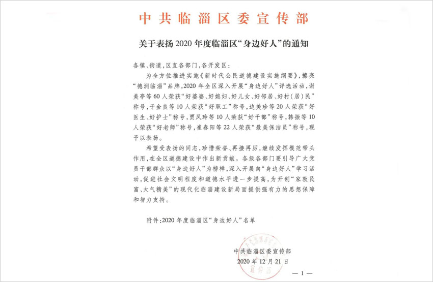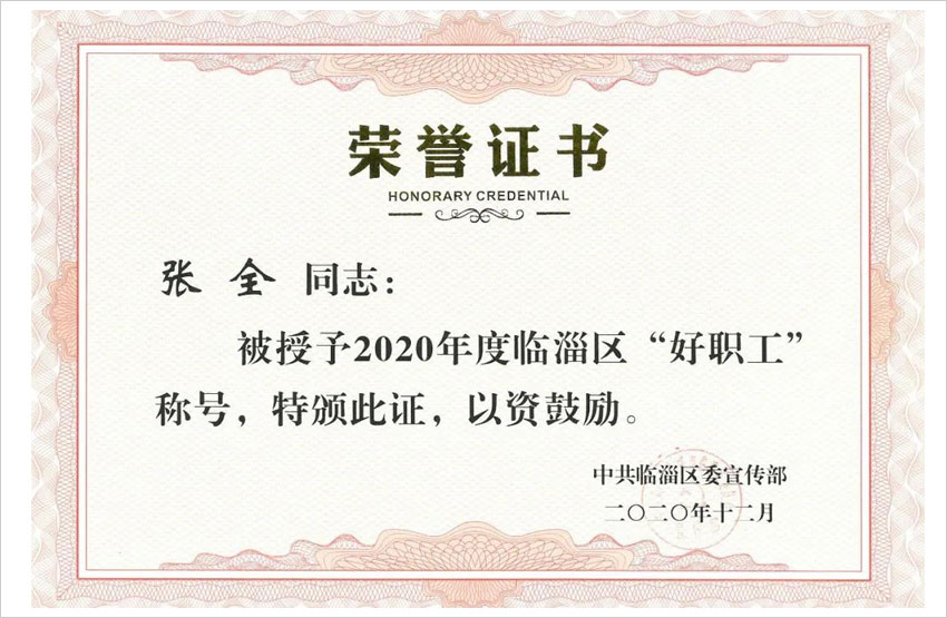 為全方位推進(jìn)實(shí)施《新時(shí)代公民道德建設(shè)實(shí)施綱要》,擦亮“德潤臨淄”品牌,由中共臨淄區(qū)委宣傳部、臨淄區(qū)總工會組織的2020年度臨淄區(qū)深入開展“身邊好人”評選活動近日揭曉,我公司鉚焊一車間員工張全榜上有名,被表彰為臨淄區(qū)“好職工”榮譽(yù)稱號。
